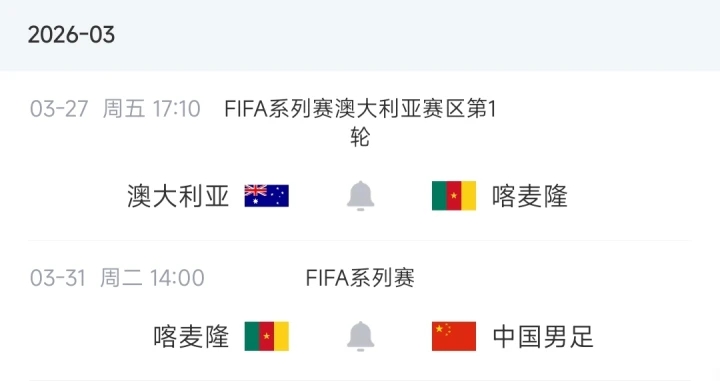 喀麦隆国度队将于3月27日17点10分对于阵澳年夜利亚国度队,3月31日14点对于阵华夏国度队。