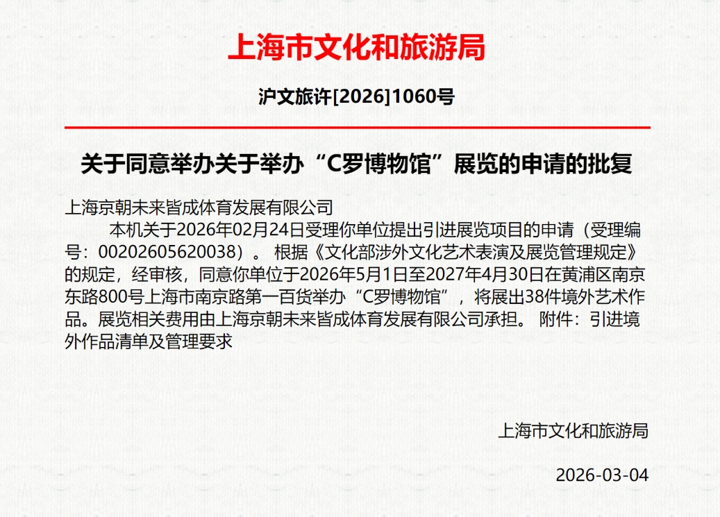 上海市文明跟游览局批复:赞成5月至来岁4月举行“C罗博物馆”