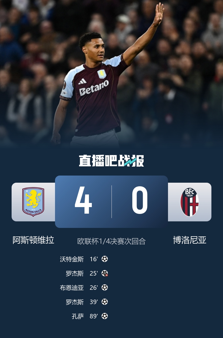 维拉4-0总比分7-1博洛尼亚升级欧联四强 沃特金斯、布恩迪亚立门