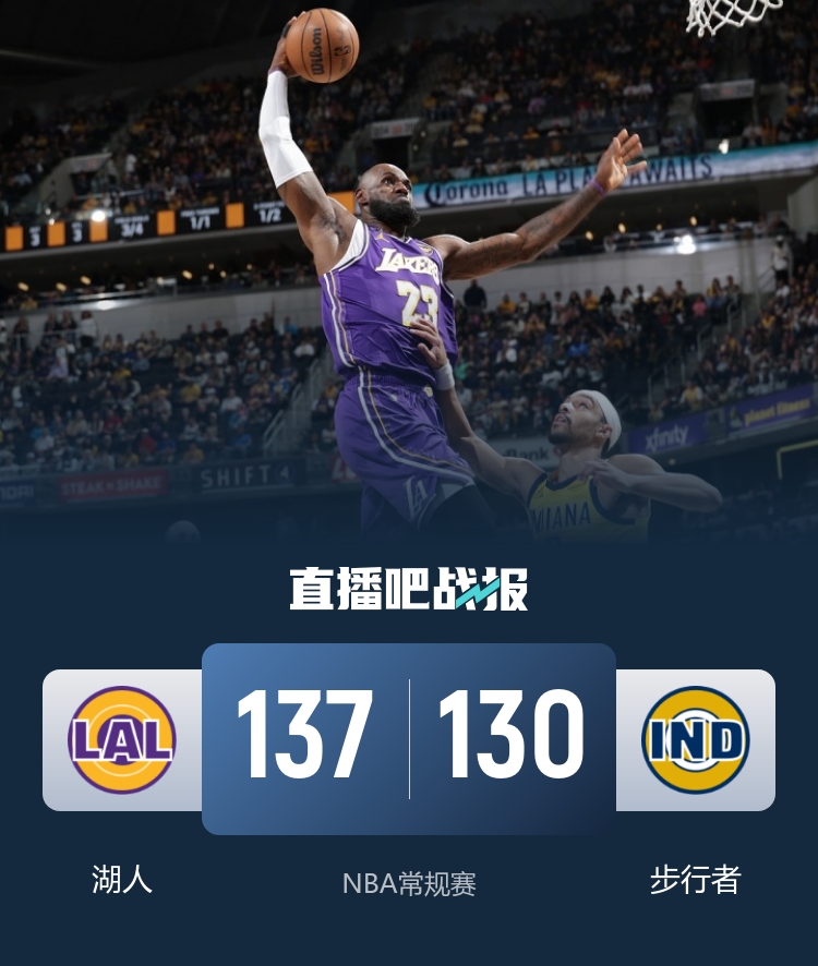 直播吧3月26日讯 NBA向例赛,湖人客场应战步辇儿者。湖人46胜26负稳居西部第3,步辇儿者16胜56负同盟垫底。终极,湖人137-130打败步辇儿者,客场克服