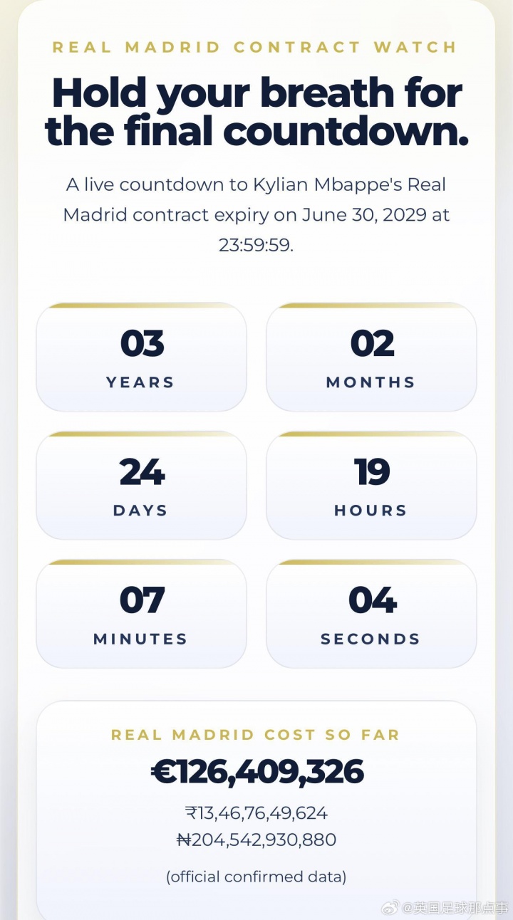 皇马球迷特地作念了一个网站,及时倒计时姆巴佩与皇马的公约到期时光(2029年6月30日23:59:59)以及消费老本