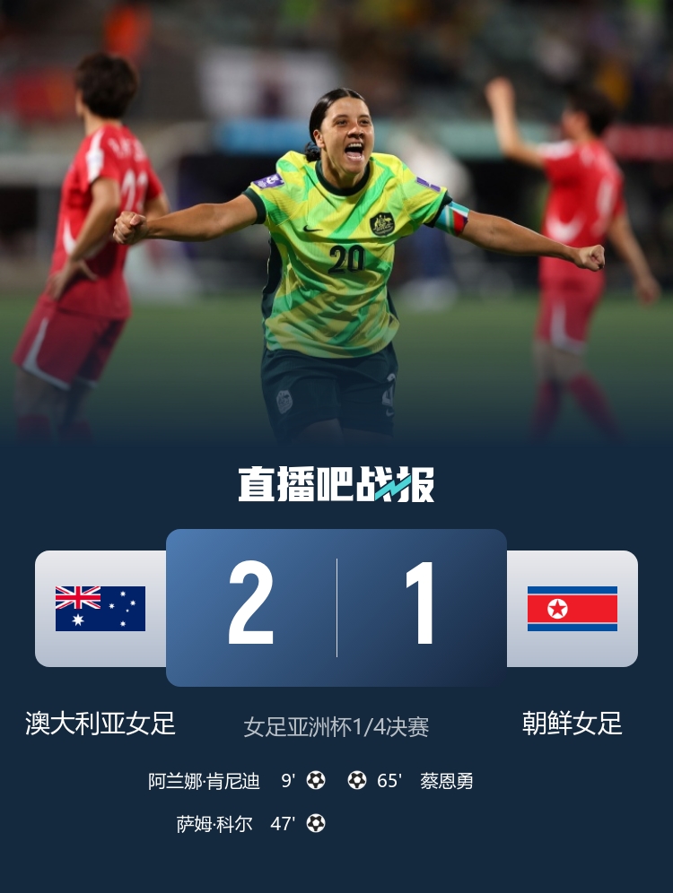 下半场补时8分钟,澳年夜利亚少女饱读2-1朝鲜少女饱读。下半场科尔远射扩张比分,蔡恩勇包围立门扳回一城,终极澳年夜利亚少女饱读2-1朝鲜少女饱读升级四强将战华夏少女饱读与华夏台北少女饱读之间胜者,澳洲少女饱读胜利升级2027巴西少女饱读天下杯,朝鲜少女饱读将加入附加赛。