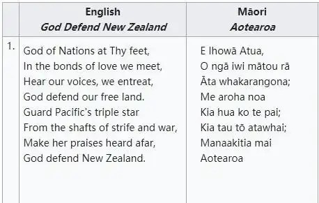 1840年,霍布森爵士与毛利首级签订了《怀唐伊公约》。按照新西兰的习气,唱国歌之时会先唱毛利语版块,而后才唱英语版块。
