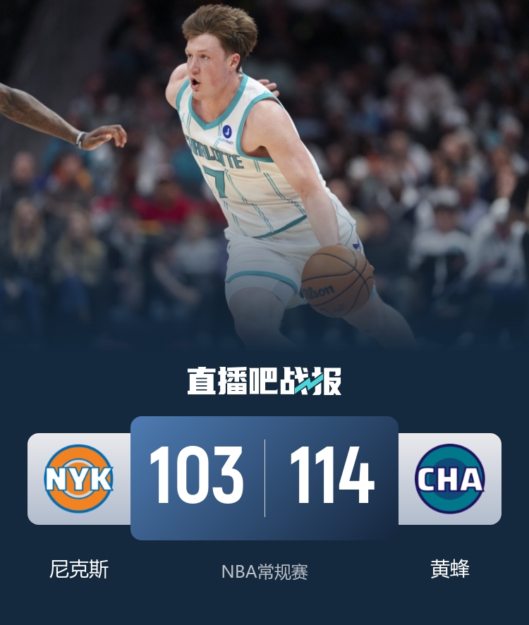 角逐最先,三球连砍8分资助黄蜂打出可以残局,随后黄蜂内线多点着花,但布伦森种种中间隔跟杀伤单节17分助尼克斯首节咬履新2分,次节尼克斯防御端碰壁,阿努诺比陆续3记三分带队追分,但但小桥跟科比·怀特陆续打破回话,黄蜂半场当先到10分。下半场,三球跟克尼佩尔又是陆续4记三分从新拉户口比分,布伦森有攻有传继承带队止血,克尼佩尔陆续中间隔合手分助黄蜂当先到18分,小节迪亚巴特种种拼抢,黄蜂一度拉户口20分以上当先,哈特陆续三分助尼克斯13-4追至个位数分差,但时光所剩无多少,终极黄蜂114-103力克尼克斯。黄蜂现在4连胜后38胜34负东部第9,尼克斯7连胜后48胜25负东部第3。
