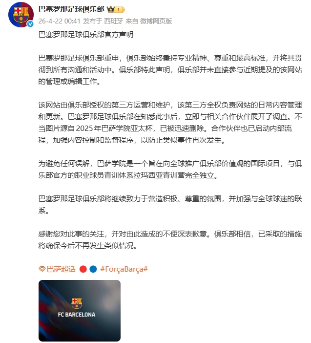 巴萨申明:未间接介入青训学院网站办理,洞悉后当即与单干方考察