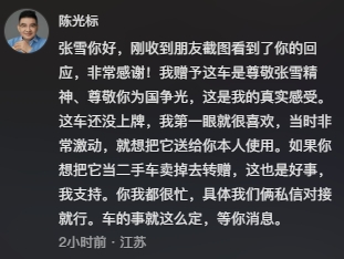 陈光方向批评收回后,就受到网好友怀疑他送车的念头,之后陈光标节略了这条批评,并又宣布了另一条批评。陈光标今早两次泛起在张雪的批评区回话。