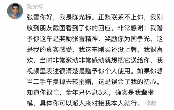 陈光标:张雪您好,刚刚收到伴侣截图顾念到了您的回话,异常谢谢!我赠送这车是尊重张雪肉体、尊重您为国抹黑,这是我的实在感触。要是您思念当二手车卖失去转捐献,这是误解了我的初心。您我王人很繁忙,详细咱们俩私函对于接就行。车的事就这样定,等您音讯。 在明天早些时分,陈光标在张雪的批评区留言:张雪您好,我是陈光标。要是您思念把它当二手车卖失去转赠,这亦然坏事,我反对