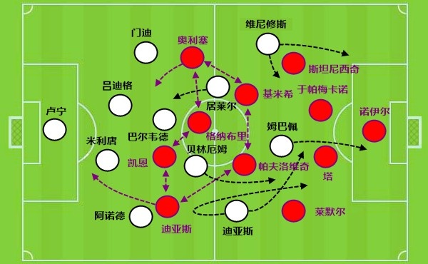 拜仁的第二个进球,成绩便是出在姆巴佩、维尼修斯跟迪亚斯的第一起防地站位有很年夜缺点,招致被于帕梅卡诺本身带球以戳破面。