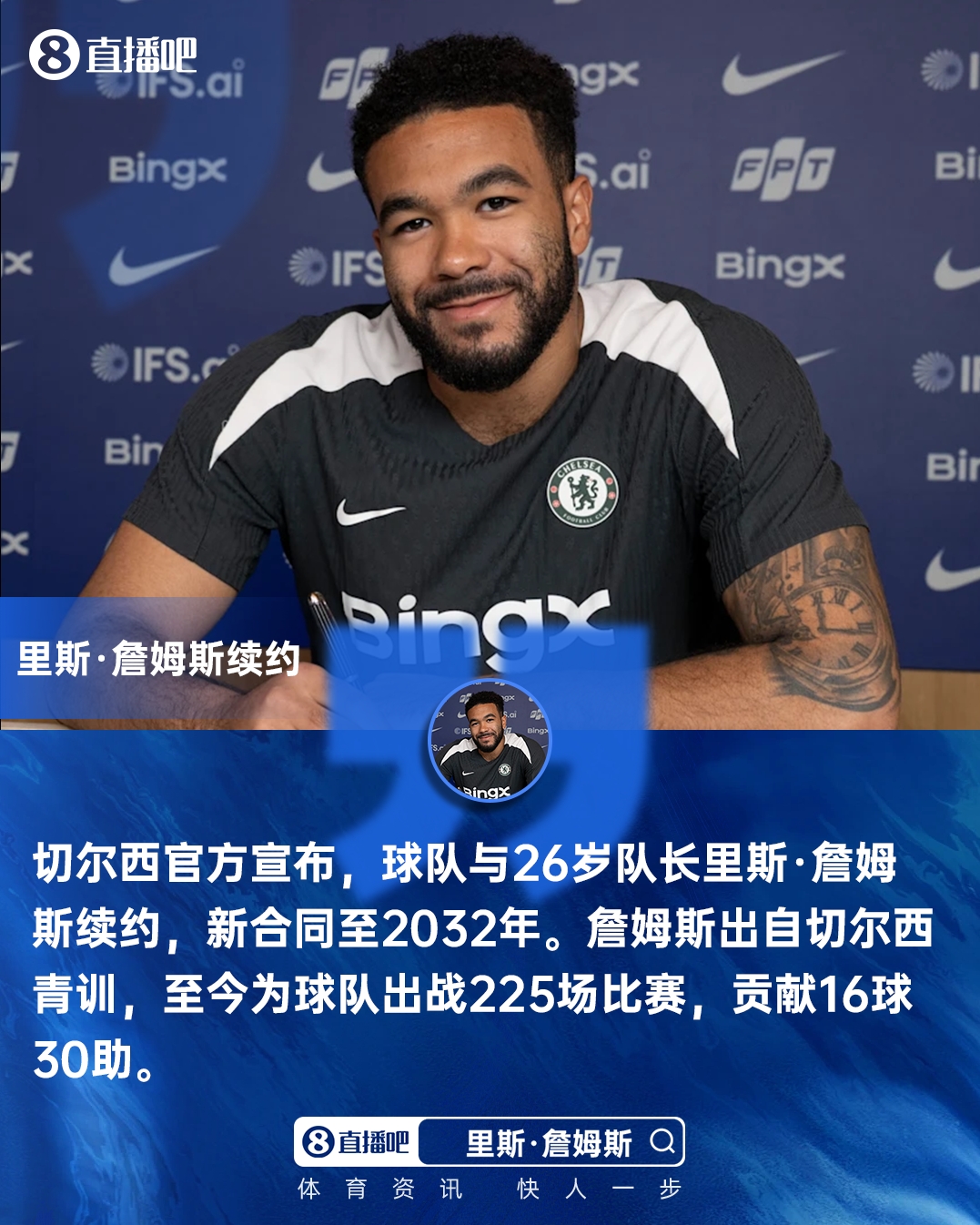 直播吧03月13日讯 民间音讯,切尔西与队长里斯·詹姆斯续约,新公约至2032年。