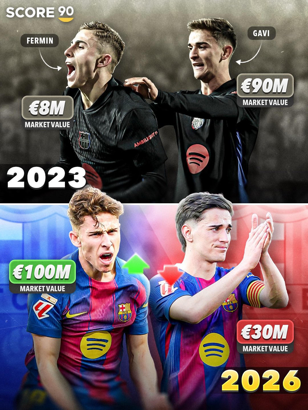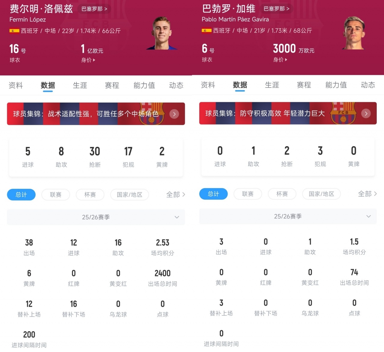 。2021年,17岁的加维就横空入世,成为了巴萨中场主力;费尔明则直到2023年20岁时才升上一队,那时加维的身价曾经高达9000万欧元,而费尔明只要800万欧元。