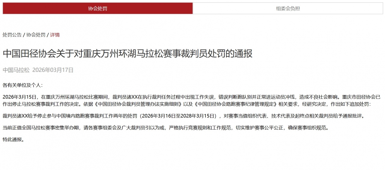 2026年3月15日,在重庆万州环湖马拉松角逐时期,评判员诸XX在履行裁判使命进程中泛起任务错误,搭档判定跑队别并畸形进静止员冲线,形成没有良社会感导。根据《华夏田径协会评判员办理方法实行细目》以及《华夏田径协会路跑赛事次序办理划定》相干请求,经钻研抉择,故故出如下追加处分: